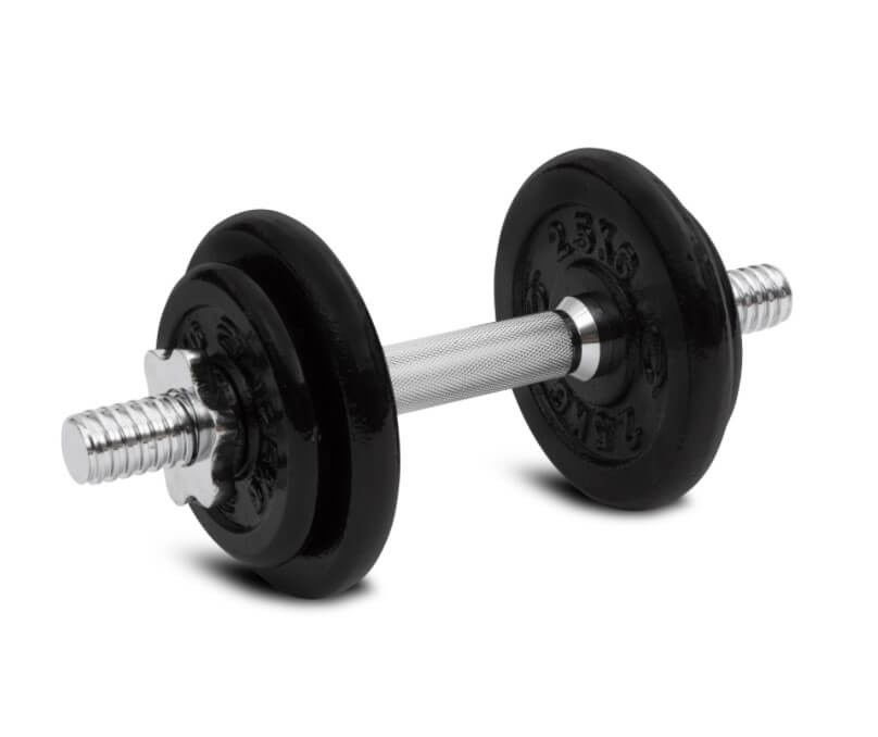 Du får 1 hantelstång på 1,25 kg, 2 x 1,25 kg viktskivor, 2 x 2,5 kg viktskivor, 2 lås samt ett förvaringsfodral.