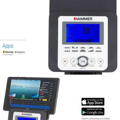 Den bakgrundsbelysta displayen gör träningsdatan lättare att följa även i svagare belysning. För dig som gärna tränar med serier, appar eller längre pass framför skärm finns också hållare för surfplatta. Surfplatta ingår inte.