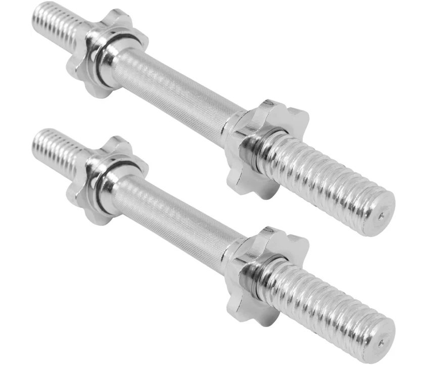 Hantelstång 2×35 cm med stjärnlås passar viktskivor med 30 mm håldiameter. Varje stång väger 2,5 kg och klarar upp till 100 kg belastning. Viktområdet är 10 cm per sida, så skivorna behöver vara högst 9 cm breda för att stjärnlåset ska få plats och hålla vikterna säkert på plats under träning.