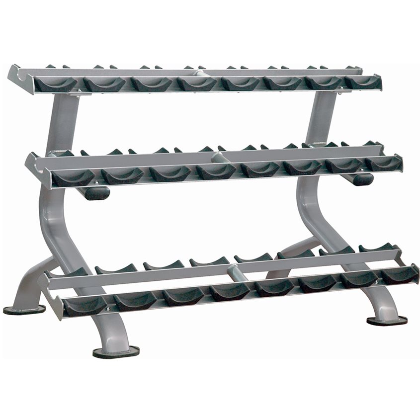 Formatet med tre plan gör det lättare att dela upp hantlar efter vikt och hålla träningsytan mer organiserad. För dig som inreder gym i företag, hotell, förening eller annan gemensam träningsmiljö innebär det en lösning som rymmer mycket utan att bli onödigt hög. Höjden på 98,5 cm gör att ställningen förblir lätt att överblicka medan bredden på 81,5 cm ger ett stabilt djup för placering av vikterna.
