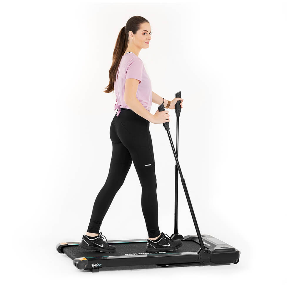 De stavinspirerade handtagen är det som tydligast skiljer inSPORTline Tyrion från många andra gåband för hemmabruk. Handtagen kan justeras i tre höjder, 92, 102 och 111 cm, vilket gör det lättare att hitta en position som känns naturlig när du går. På det högra handtaget sitter dessutom kontroll för start, stopp och hastighet, så du slipper luta dig fram till displayen under passet.