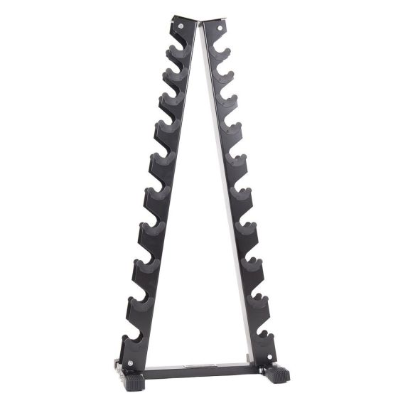 Stället är avsett för 10 par hexagonhantlar i storlekarna 1-10 kg med standardiserade mått. Hyllplanen har progressivt större utrymme mellan nivåerna för att passa den ökande storleken mellan lättare och tyngre hantlar inom det spannet. Det är viktigt att känna till att modellen är byggd för en blandad uppsättning 1-10 kg och inte för att fyllas med enbart större hantlar.