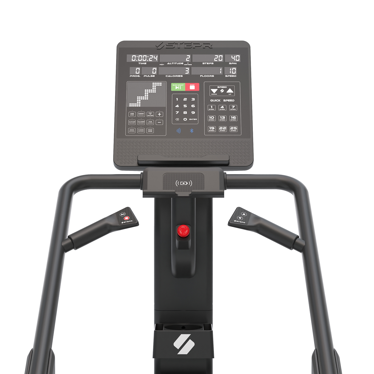 Den inbyggda LED-datorn visar antal steg, kaloriförbrukning, tid, antal våningar och puls. Det ger användaren direkt överblick över belastning och träningsvolym utan att navigera genom komplicerade menyer. Bluetooth finns också för uppkoppling och maskinen har både mobil- eller surfplattehållare och USB-C-laddare, vilket underlättar vid appträning eller längre pass.